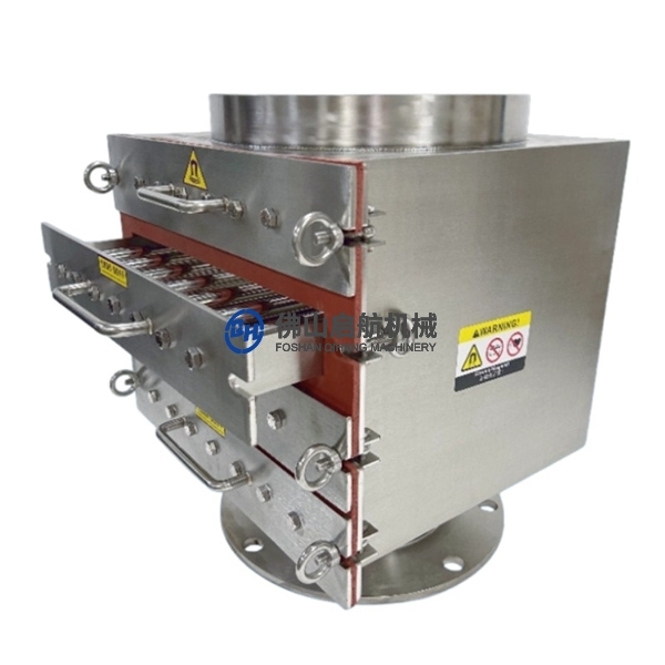 抽屉式除铁器使用范围广、效果好、无能耗、无污染的一个系列。产品设计安装位置于进(出)料口, 生产线的前端或者末端用于去除铁磁杂质,弱磁铁污染物以及其他自由流动的外部输送材料(如颗粒和粉末)和其他小顺磁颗粒,可有效大大的净化材料,提高材料质量, 保护产品的安全免受黑色金属的破坏,确保加工设备的有效运行。